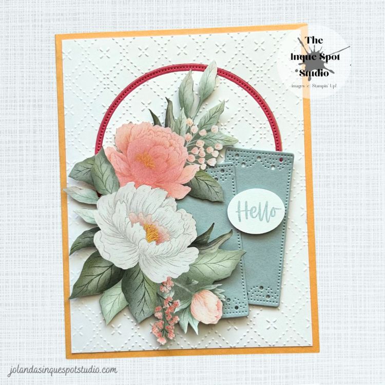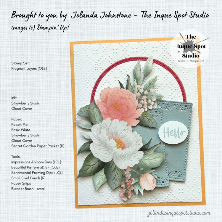 - The sentiment, Hello, from the Fragrant Layers stamp set, another On-Line Exclusive product, was stamped with Cloud Cover ink and punched out with the retired (3/4” x 15/16”) Oval Punch and popped up with a few Mini Dimensionals.