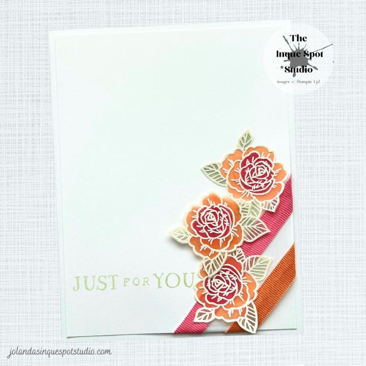 • Diagonal Stripes: Timid Tiger and Strawberry Slush Faux Linen Ribbon and retired White Satin Ribbon pieces were cut and taped around the bottom right corner.