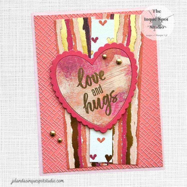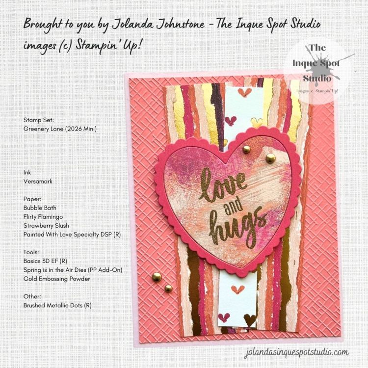 - The sentiment, love and hugs, from the Greenery Lane stamp set was stamped with Versamark ink and heat-set with Gold Embossing Powder onto the Heart In-Set.