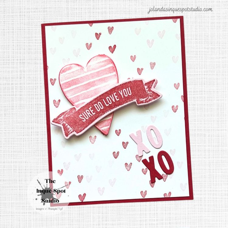 - The sentiment, Sure do love you, from the retired Sure Do Love You stamp set, was stamped with Real Red ink and die-cut with the coordinating Banner die, also from the Lots To Love Box Framelits Dies set.