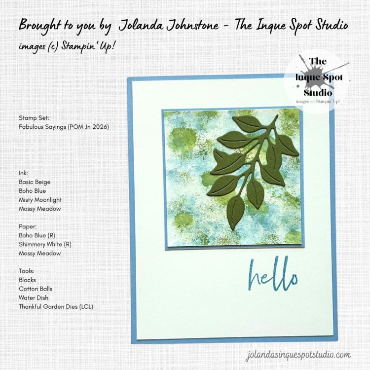 - The greeting, Hello, from the Fabulous Sayings stamp set, the Product of the Month selection for January 2026, still available, was stamped with Boho Blue ink, retired but seemed to match the lighter blue color block.