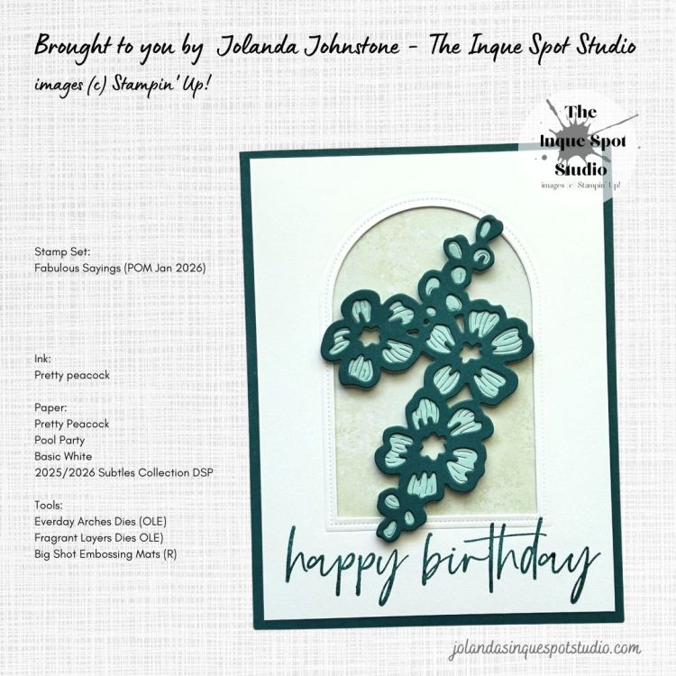 - The sentiment, Happy Birthday, from the Fabulous Sayings stamp set, the Exclusive January 2026 Product of the Month, still available with a qualifying purchase, was stamped with Pretty Peacock ink.