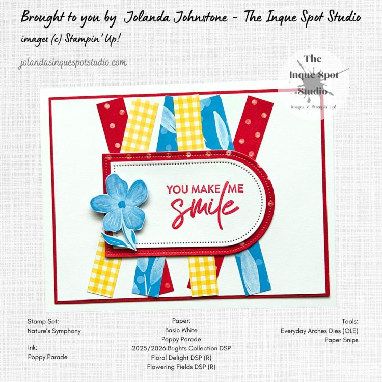 - The sentiment, You make me smile, from the Nature’s Symphony stamp set was stamped with Poppy Parade ink and then die-cut with the (2⅞” x 1⅝”) Arch die, from the same dies set.