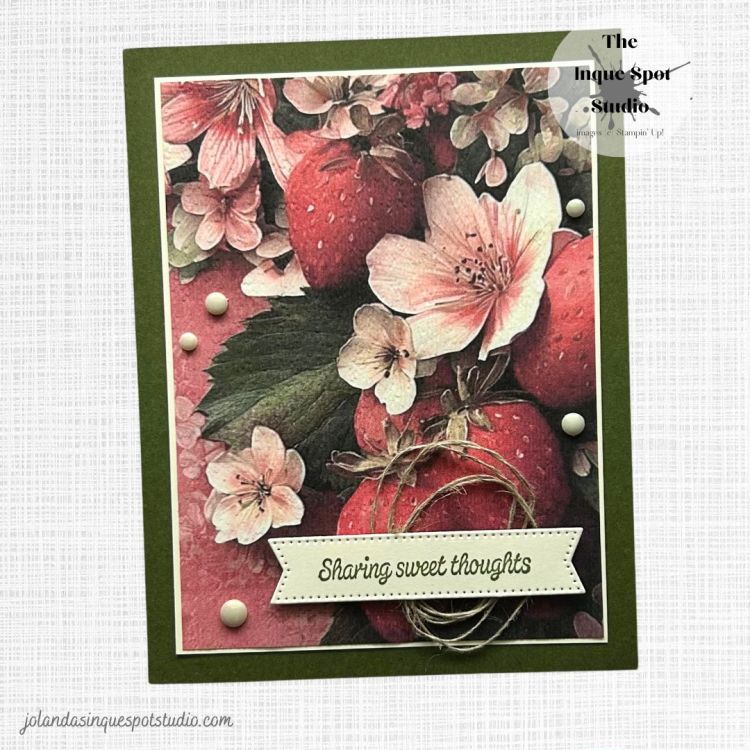 - The sentiment, Sharing sweet thoughts, from the same titled retired stamp set, was stamped with Mossy Meadow ink and then die-cut with the (2¾” x ⅝”) Stitched Banner die from the Stylish Shapes Dies set.