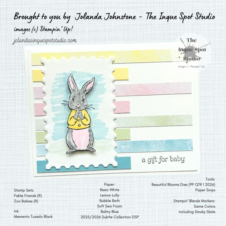 - Long Strips: (5” x ⅜”) Lemon Lolly, Bubble Bath, Soft Sea Foam and Balmy Blue Splatter patterned pieces of paper from the 2025/2026 Subtles Collection Designer Series Paper pack.
