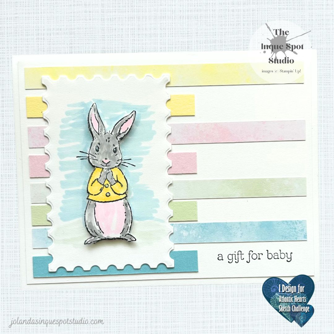 All elements were adhered to the card base to resemble the sketch. The colored Bunny was popped up with Dimensionals.