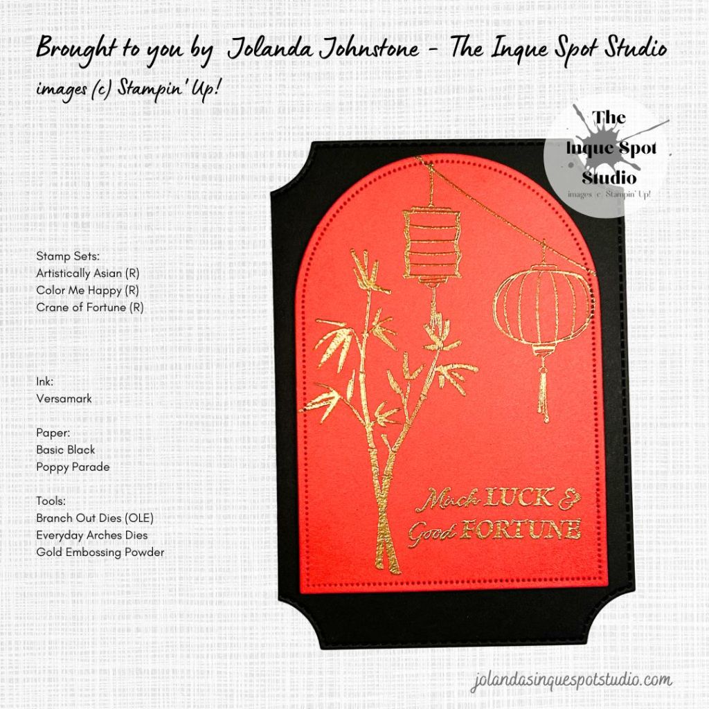 The elegant gold stamped Arch was popped up with Dimensionals onto the Shaped Card Base, keeping the card clean and simple with lots of “red” space – Chinese style.