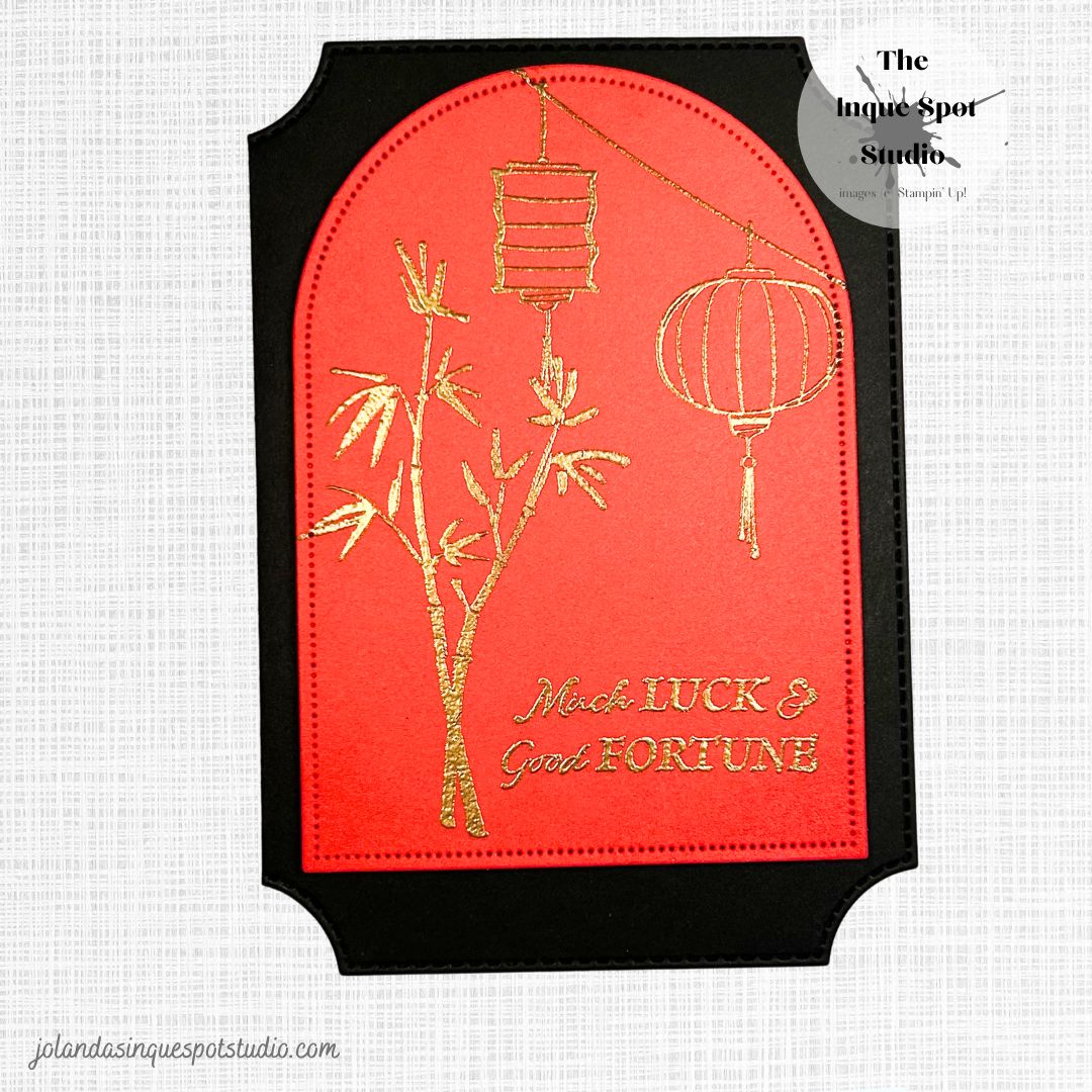 The elegant gold stamped Arch was popped up with Dimensionals onto the Shaped Card Base, keeping the card clean and simple with lots of “red” space – Chinese style.