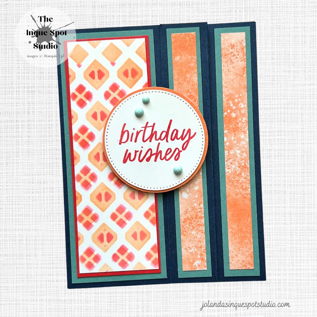 The (1”) scored flap was adhered backwards for the simple fun fold and all elements were adhered to the card. A (3” x 5¼”) Basic White Writing Panel was added to the inside of the card. The Sentiment Circle was popped up with Dimensionals and a few Blue-toned retired Opaque Faceted Gems were added for a bit of fun.