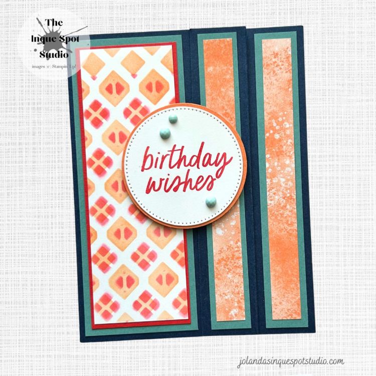- The sentiment, Birthday Wishes, from the Simply Said stamp set was stamped with Poppy Parade ink and then die-cut with the (2⅛”) Stitched Circle die from the Stylish Shapes Dies set.