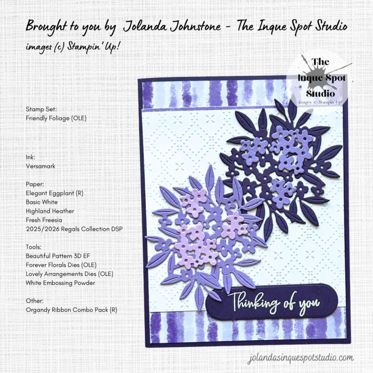 - The sentiment, Thinking of You, from the Friendly Foliage stamp set was stamped with Versamark ink and heat-set with White Embossing Powder.