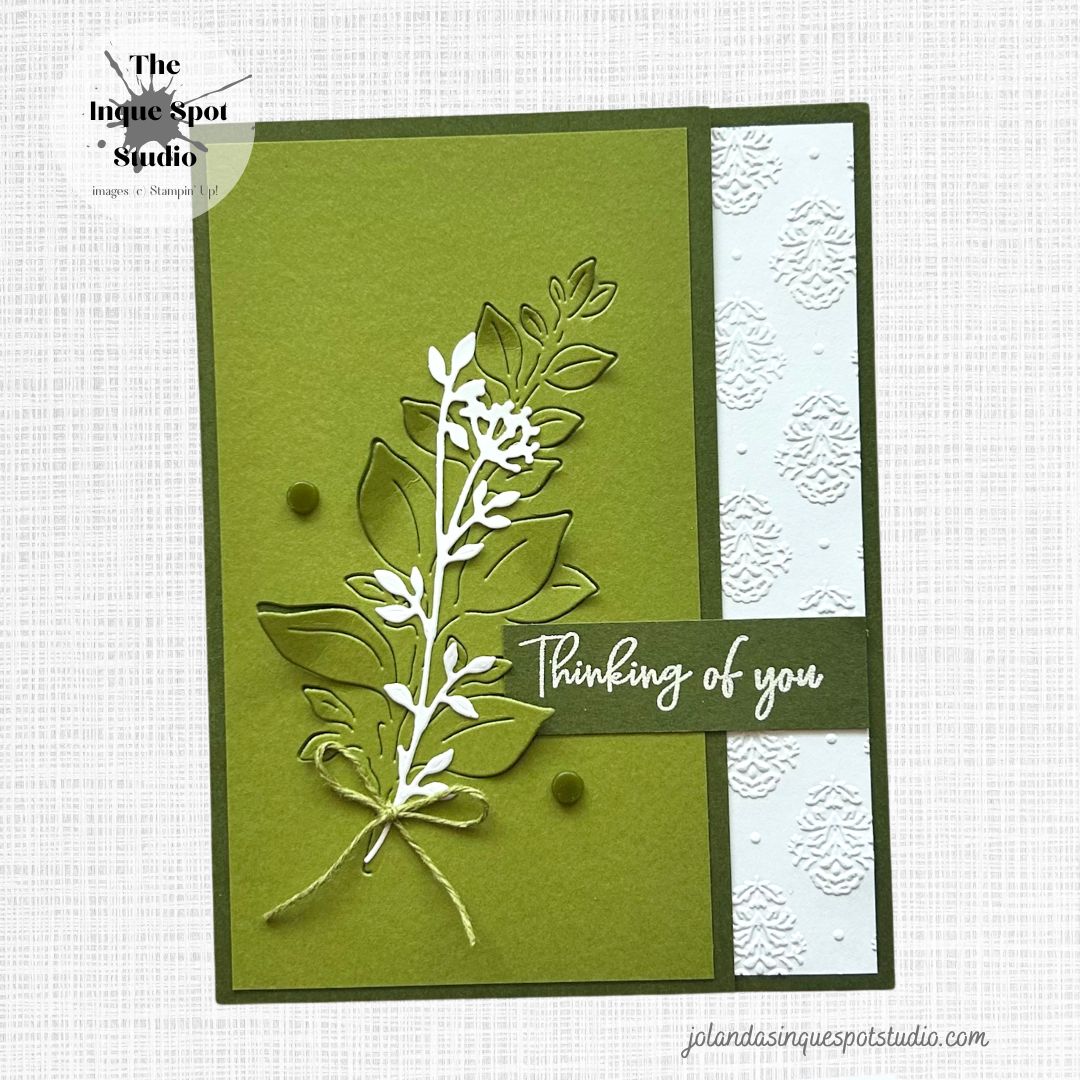 - The sentiment, Thinking of You, from the Friendly Foliage stamp set, an On-Line Exclusive product, was stamped with Versamark ink and heat-set with White Embossing Powder. Trimmed size (2¼” x ⅝”).
