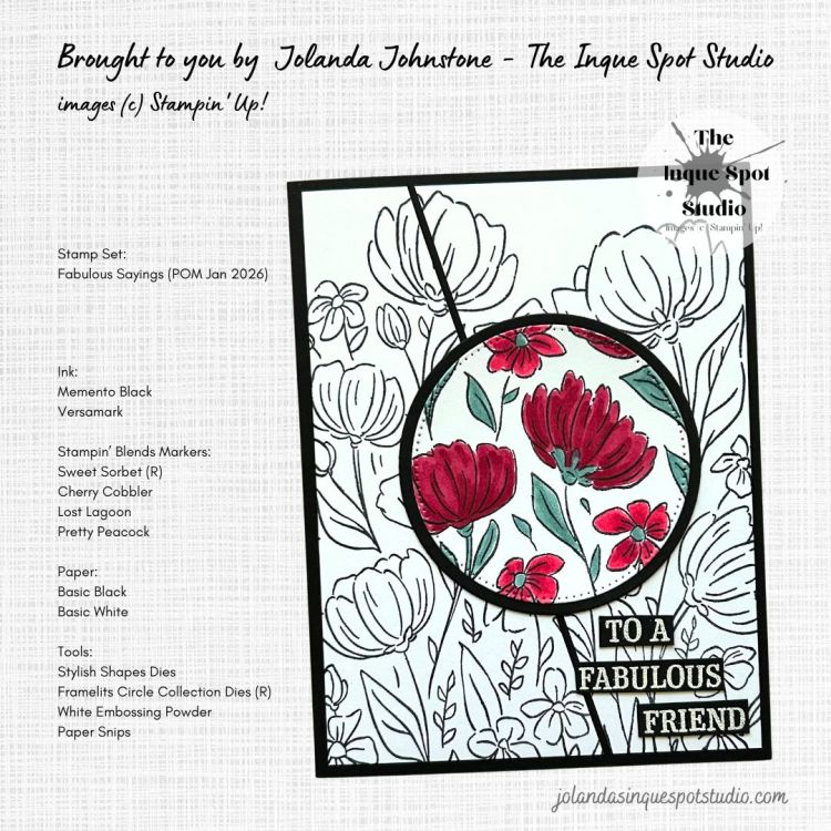 - The sentiment, To a fabulous friend, from the Fabulous Sayings stamp set, the January 2026 Exclusive Product of the month, was stamped with Versamark ink and heat-set with White Embossing Powder and then cut apart and trimmed with Paper Snips.
