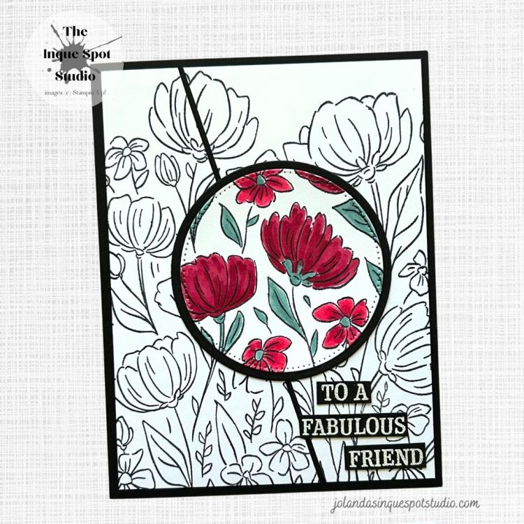 - The Floral image from the Flowers Fair background stamp, a new On-Line Exclusive product, was stamped with Memento Tuxedo Black ink.