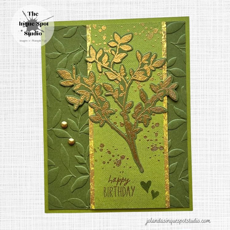 - The Leaf Branch image from the Nature’s Symphony stamp set was also stamped with Versamark and heat-set with Gold Embossing Powder and then die-cut with the coordinating die from the Nature’s Symphony Dies set.