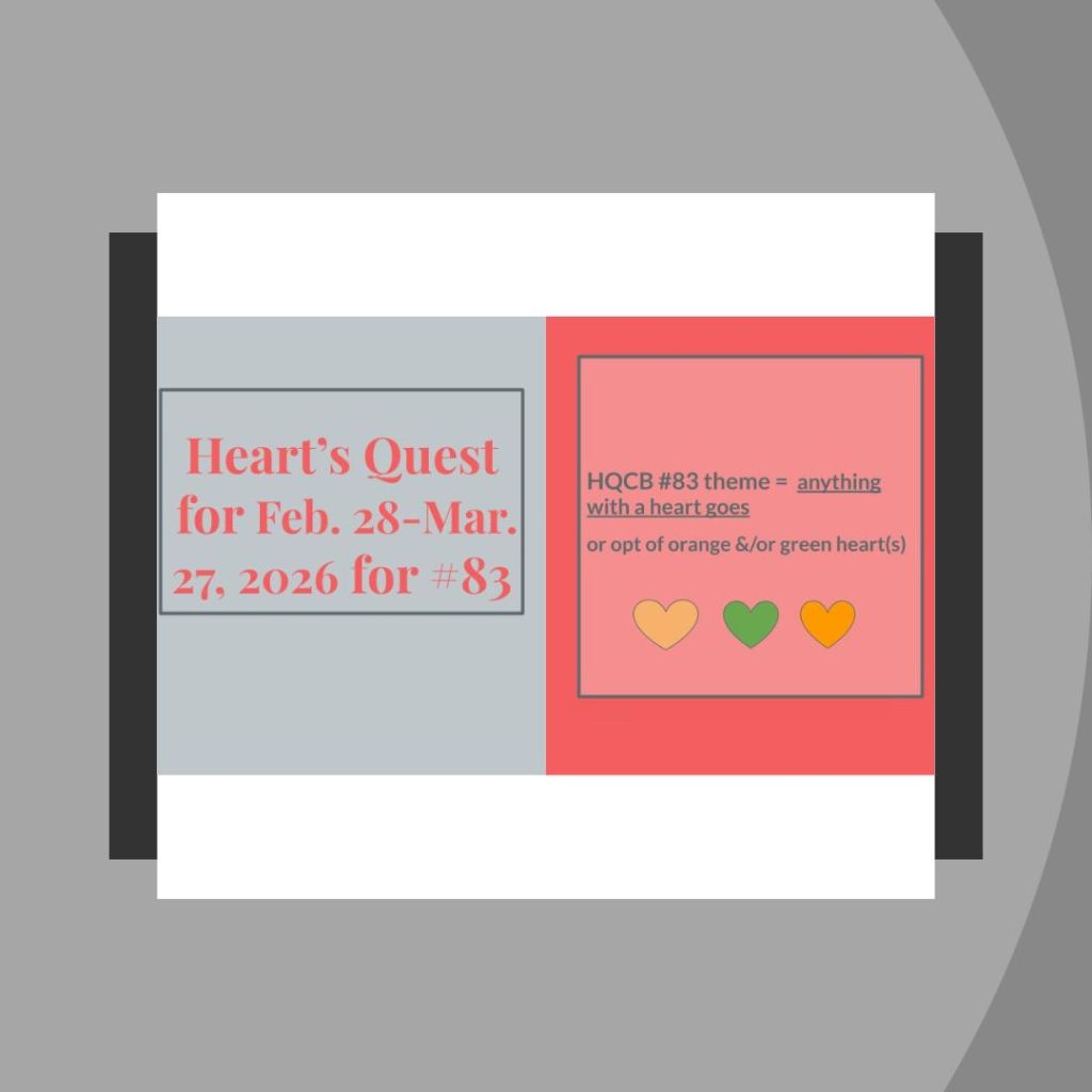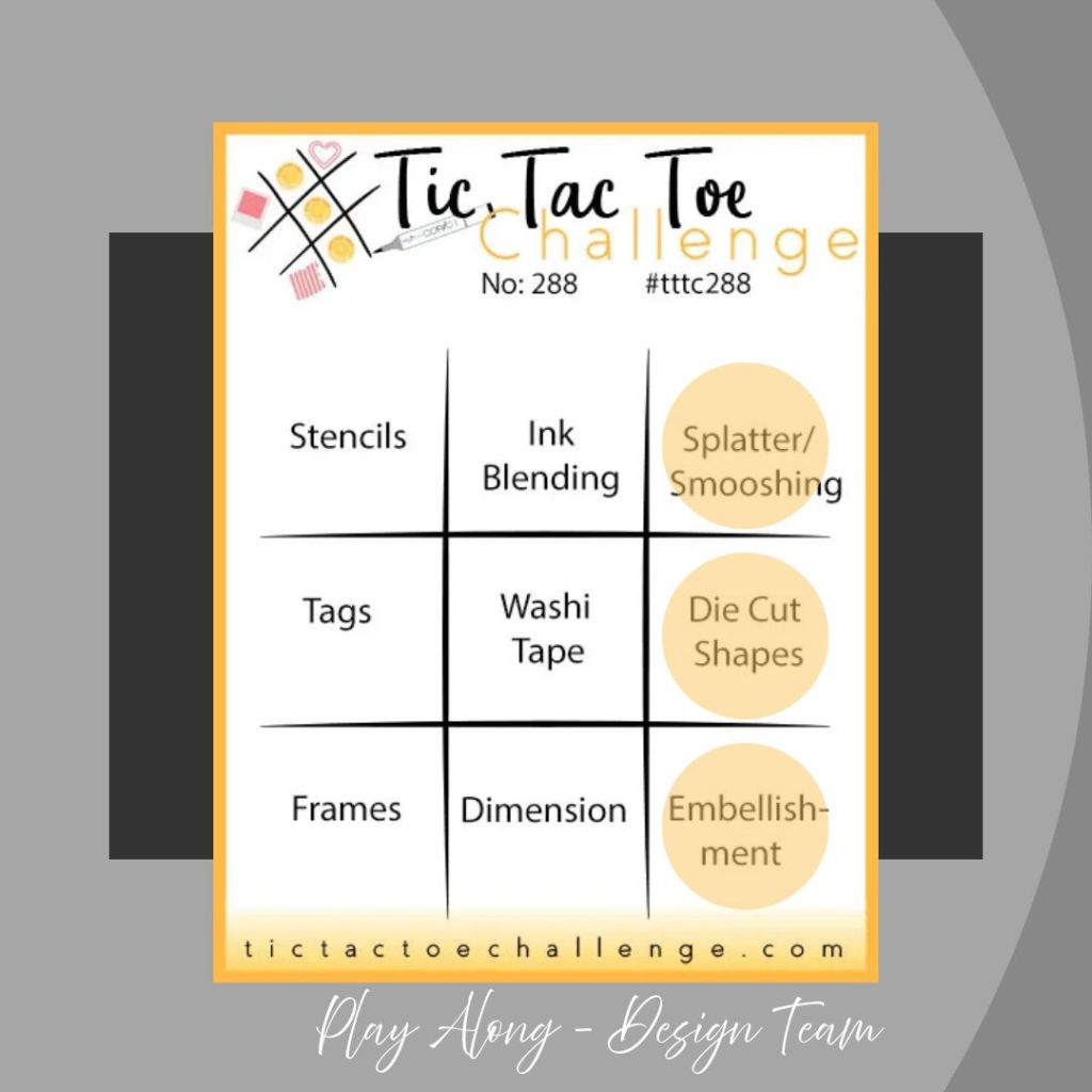 Additionally, I am playing with Heart’s Quest (#83) to add Green Heart(s) and the current Tic Tac Toe (#288) Board choosing the right column, to use Dies, adding Splatters and Embellishments.