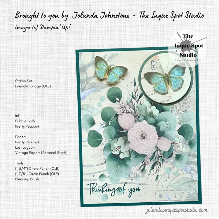 - The sentiment, Thinking of You, from the Friendly Foliage stamp set, an On-Line Exclusive product, was stamped with Pretty Peacock ink.