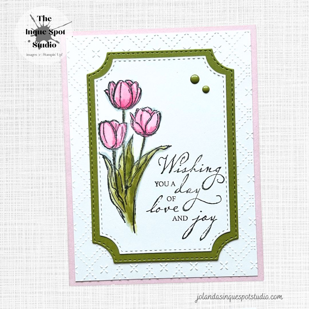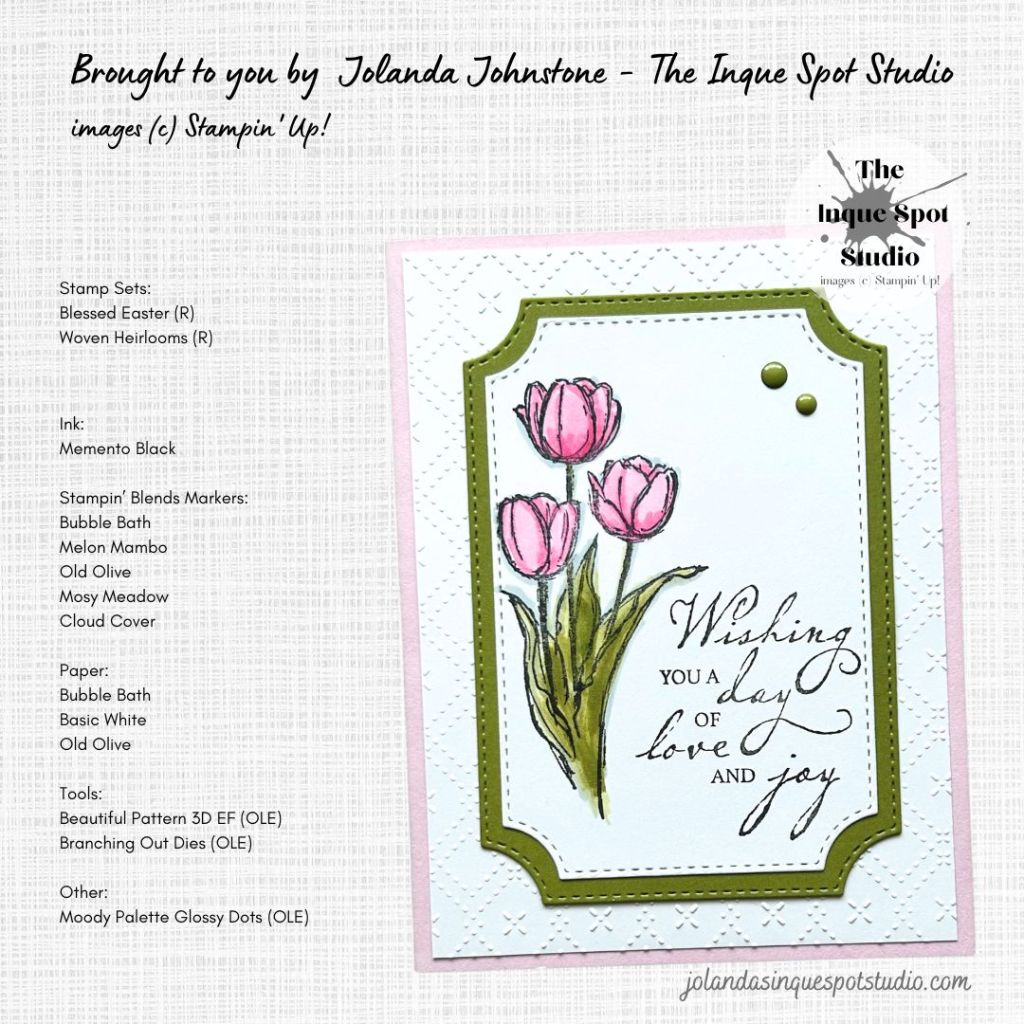 - The Tulip image from the retired Blessed Easter stamp set (circa 2014) was stamped with Memento Tuxedo Black ink and colored with Stampin’ Blends Markers. Colors Chosen: Blooms – Light and Dark Bubble Bath with Light Melon Mambo; Leaves – Light and Dark Old Olive with Light Mossy Meadow; Shadows – Light Cloud Cover.