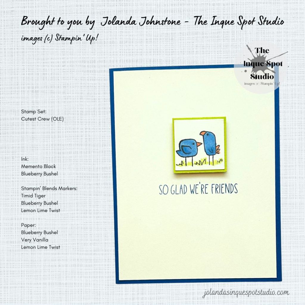 #stampinup, #jolandajohnstone, #theinquespotstudio, #rubberstamping, #stampsinkpaper, #papercrafting, #cardmaking, #diycards, #handmadecards, #cardmakingideas, #craftingideas, #artsandcrafts, #cardmakingsupplies, #craftingsupplies, #makeacardsendacard, #CutestCrew, #friendshipcards, #greetingcards, #StampinBlendsMarkers, #coloring, #stampinupdemo, #cardmaker, #handmade, #CreativeColoursChallenges, #CCC233, #ColorChallenge,