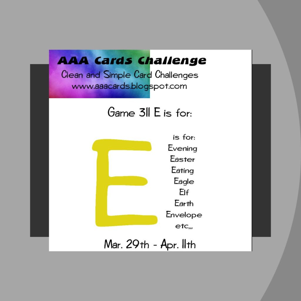 My reverse clean and simple design was influenced by several similar challenges: Alphabet (Letter X) for X-Ray featuring a black and white color scheme; Little Red Wagon (#851) with a Retro Rock & Roll theme; Krafty Chicks (#813) for a Masculine card; Addicted to CAS (#304) to add Stripes; Inkspirational (#364) for a CAS card with a twist using the Letter E; and AAA Cards (#311) with the same requirement.
