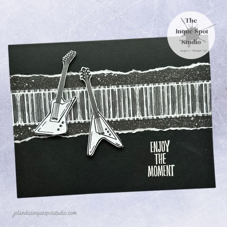 • Torn Strip: (5½” x 2”) Black & White Splatter patterned piece of paper from the retired Rock & Roll Designer Series Paper pack hand torn to expose the white edges.