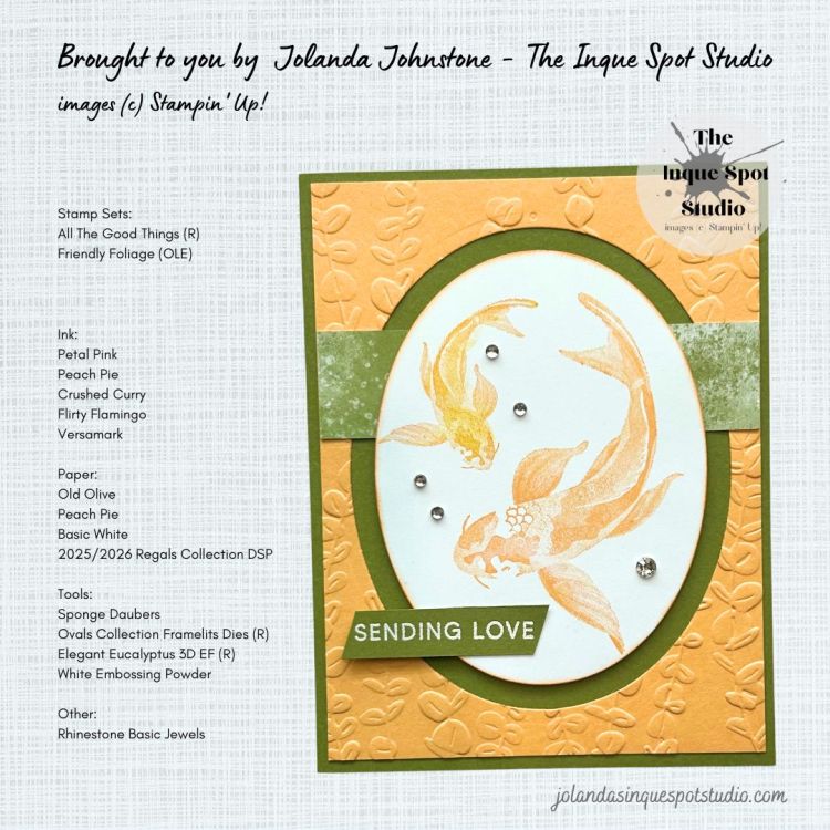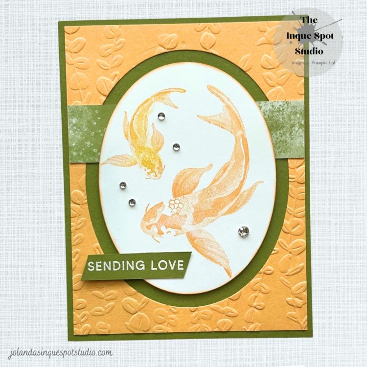 - The Koi Fish from the retired All The Good Things stamp set were chosen. The larger Fish was inked with Petal Pink and then Peach Pie ink was added (kissed) with a Sponge Dauber. The smaller Fish was inked with Crushed Curry and then Flirty Flamingo was added with a Sponge Dauber.