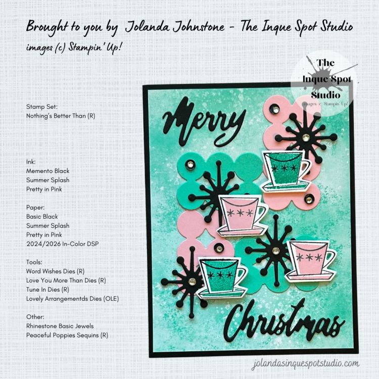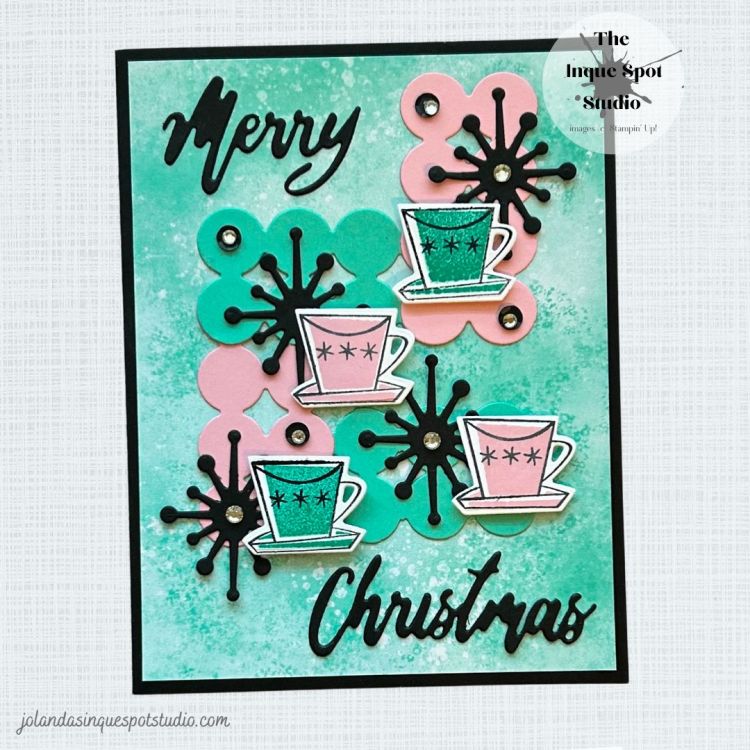 All elements were adhered to the card base. The Coffee Cups were popped up with Dimensionals and several Black Sequins from the retired Peaceful Poppies Sequins pack and several Rhinestone Basic Jewels were added for a bit of Festive bling.