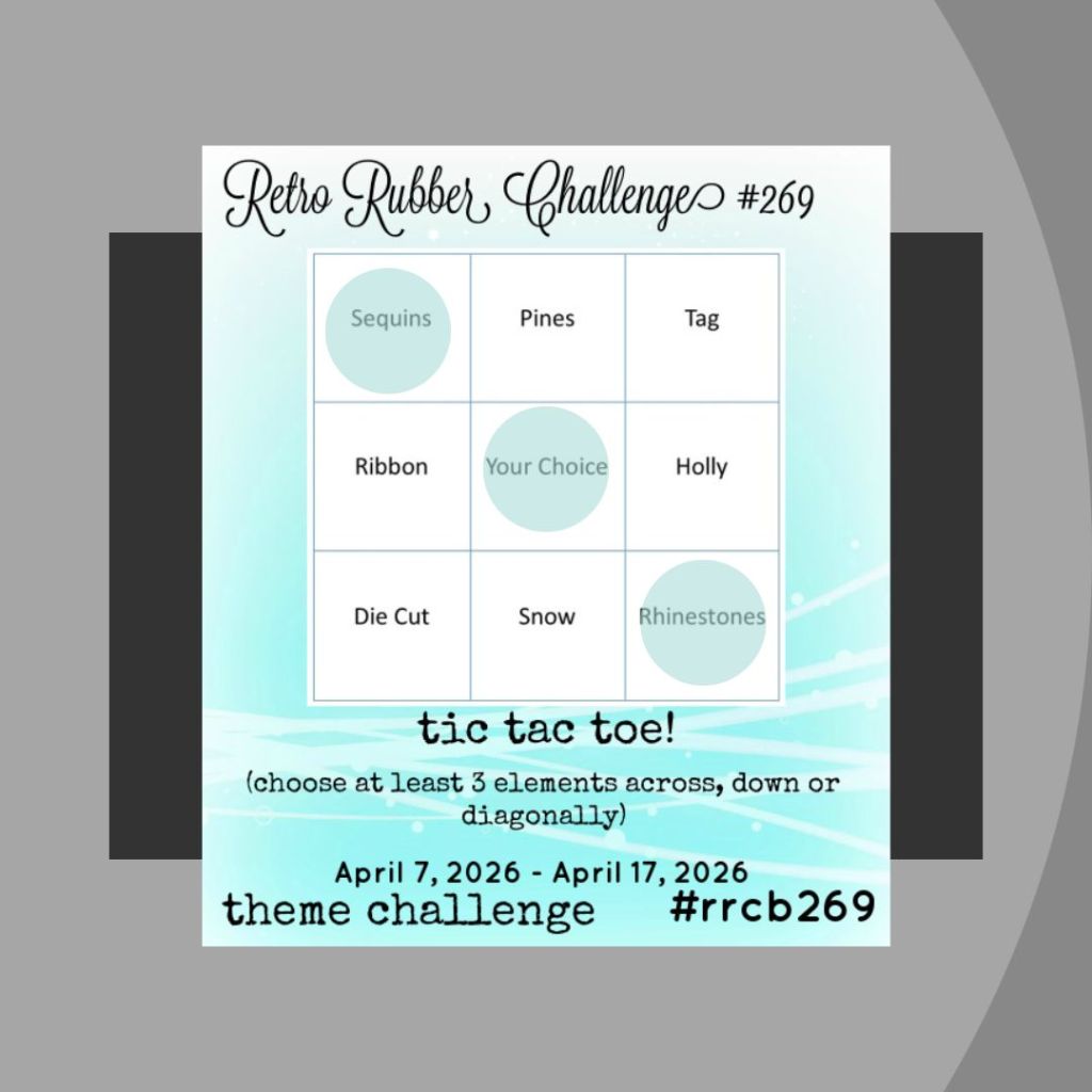 Design choices were influenced by the Retro Rubber (#269) Wintry Tic Tac Toe board, choosing Sequins, Rhinestones and Dies for my FREE Space and loosely inspired by the current TGIF (#572) Sketch, shown for reference.