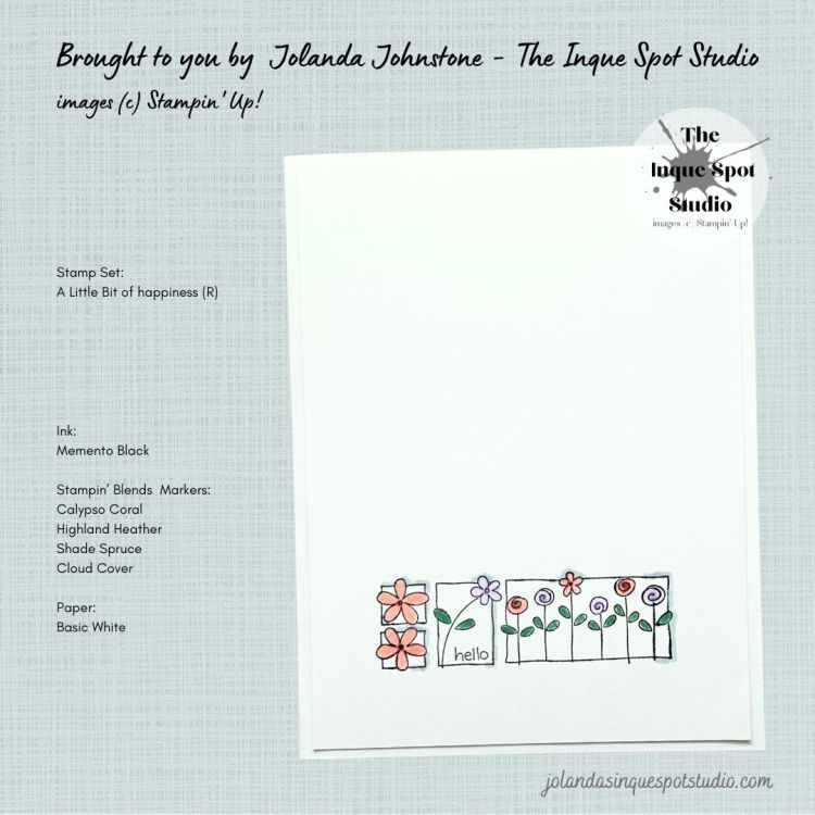 - The Floral Block image from the retired A Little Bit of Happiness stamp set, was selectively inked with Memento Tuxedo Black ink to get the three shapes.