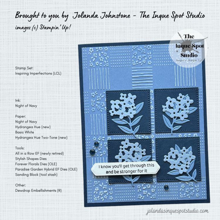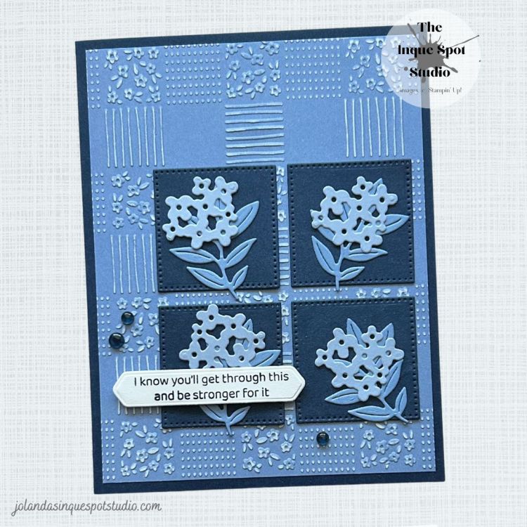 - The sentiment, I know you’ll get through this and be stronger for it, from the Inspiring Imperfections stamp set, still available but now on the Last Chance List, was stamped with Night of Navy ink and then die-cut with the Label die from the Paradise Garden Hybrid Embossing Folder dies.