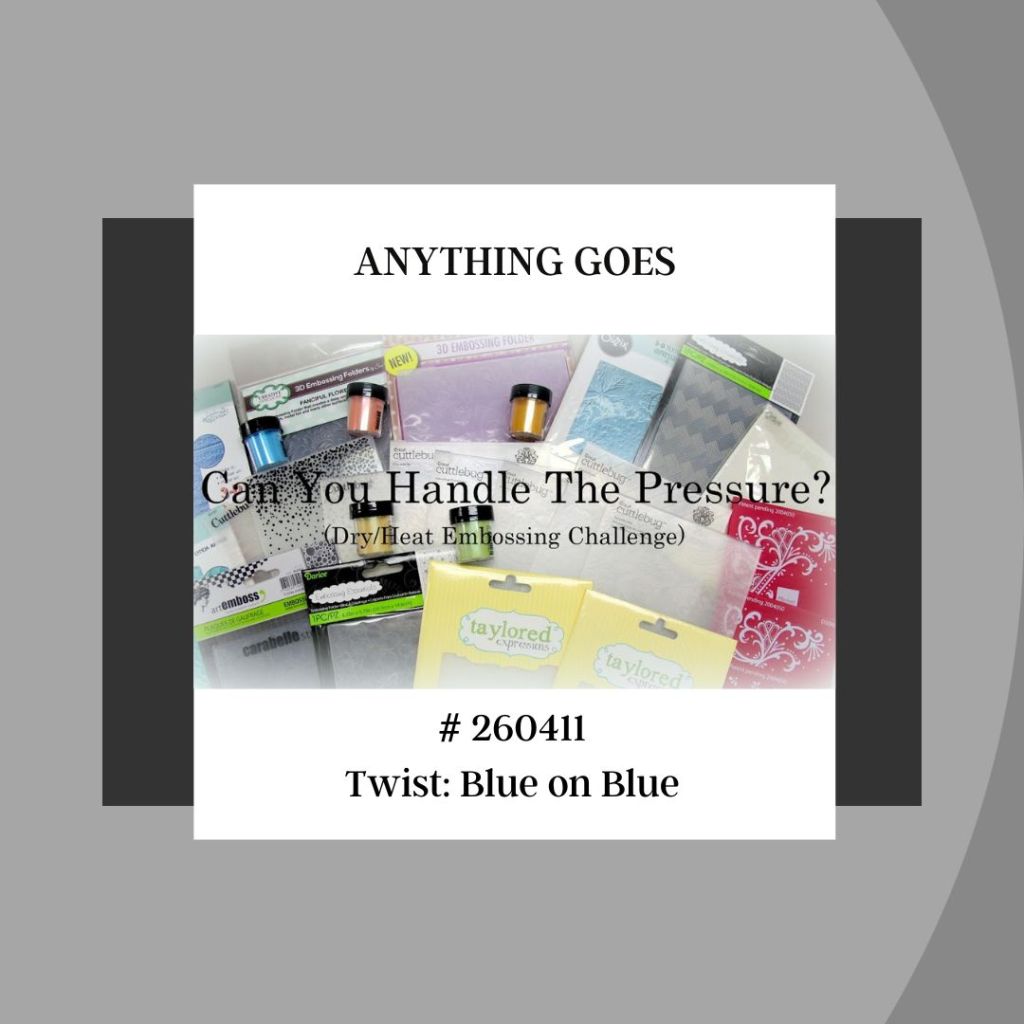 The challenges: Can You Handle the Pressure (#260411) for a Blue-on-Blue embossing twist which I tied into Little Red Wagon (#854) That Song for “Song Sung Blue”.