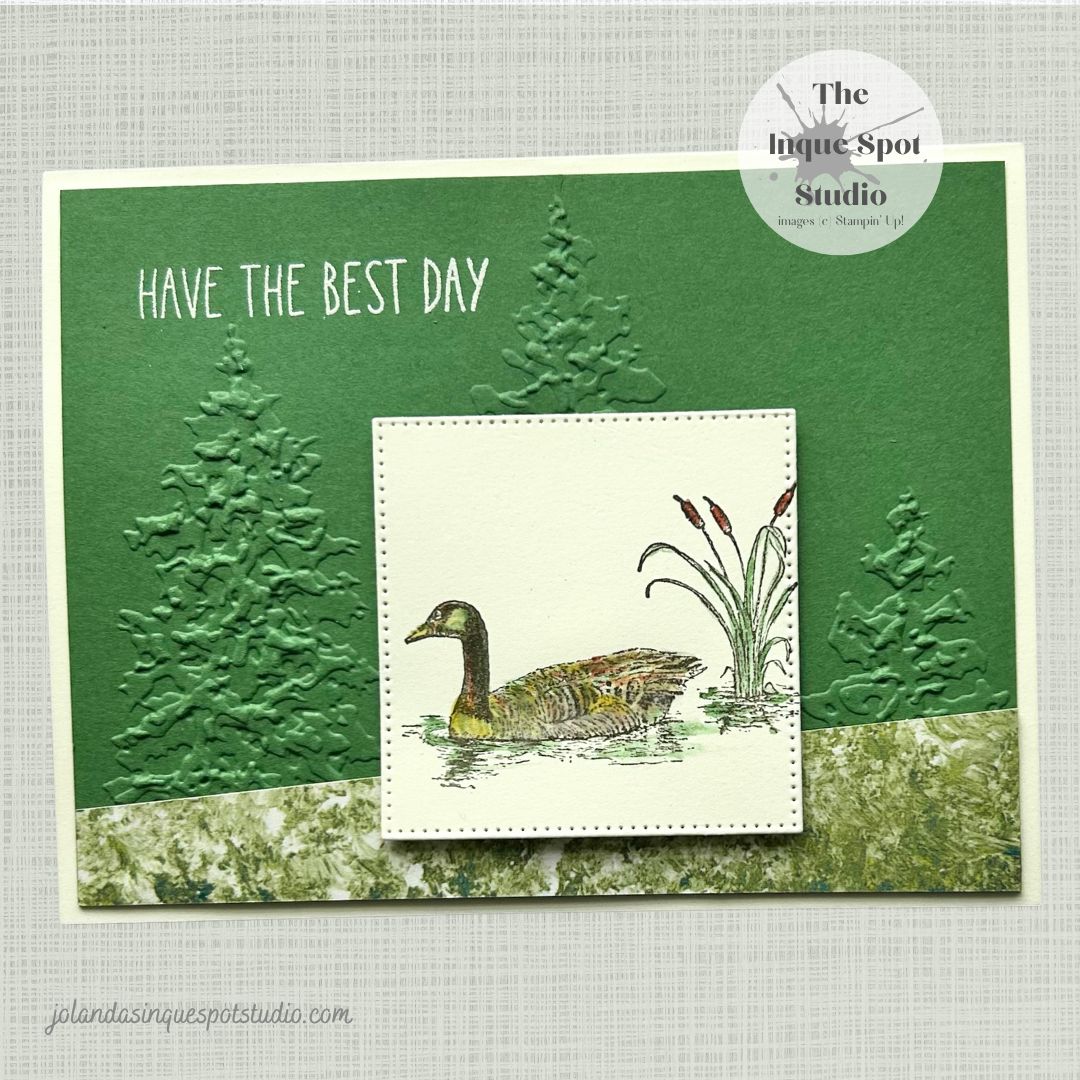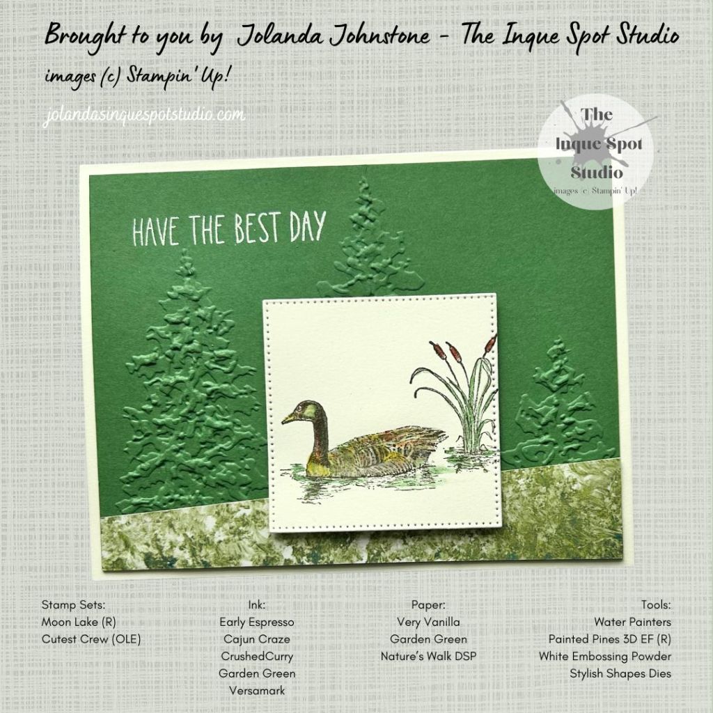 - The Duck Pond image from the retired Moon Lake stamp set was stamped with Early Espresso ink and lightly watercolored with the Fine-Tipped Water Painter using Cajun Craze, Crushed Curry and Garden Green inks.