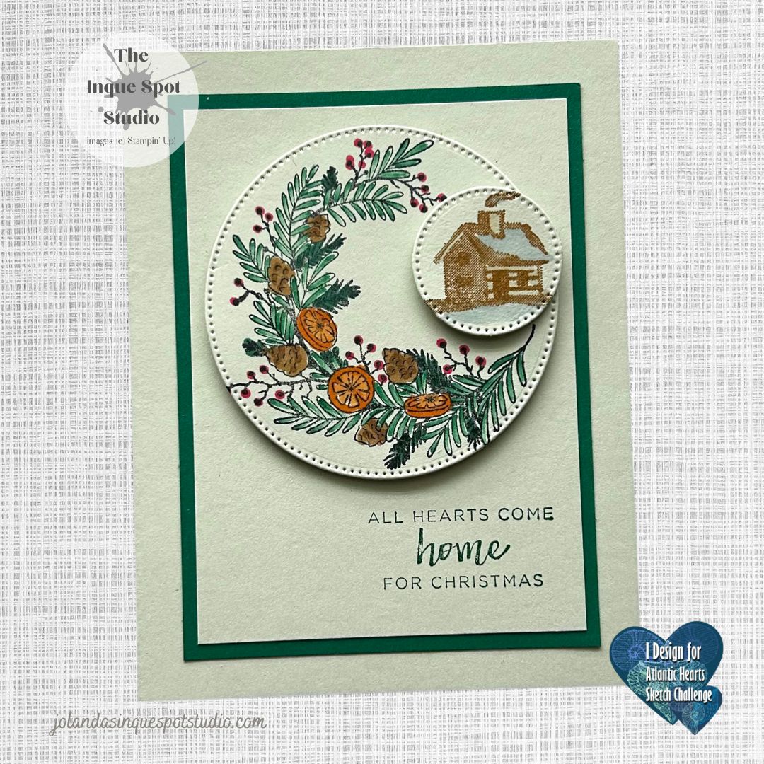 Welcome back! Design Team Time for the Atlantic Hearts Sketch Challenge (#650). Lots of possibilities with this one! Design influences: Jingle Belles (#2520) for the theme and Color Throwdown (#842) for the palette. Here is the result: Steps: All elements were adhered to the card base to resemble the sketch. Both the Swag Wreath andContinue reading “Joyful Tidings – Home for Christmas”