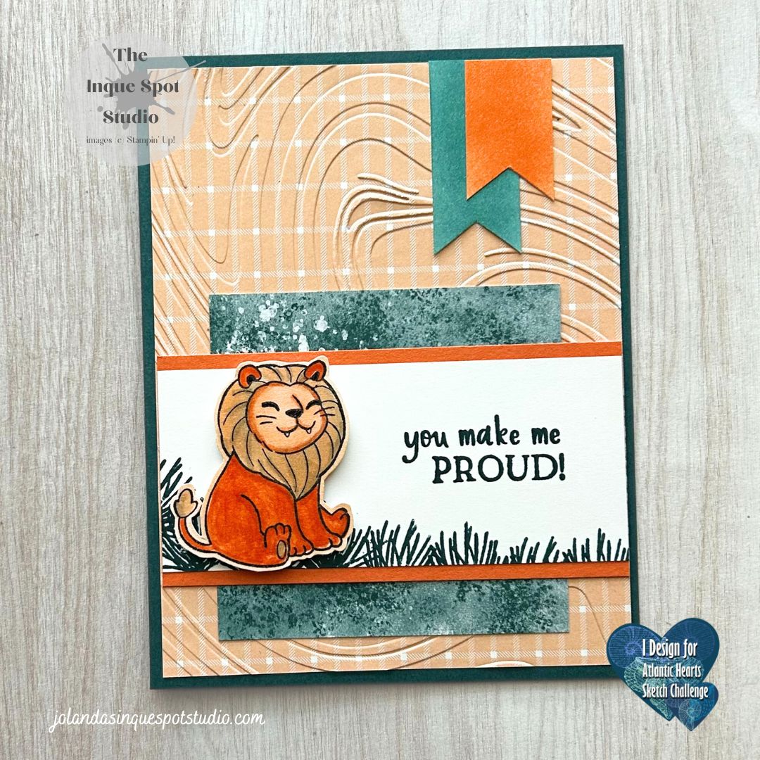 Welcome back! Design Team Time for the Atlantic Hearts Sketch Challenge (#645). Lots of possibilities with this one. Design influences: Critter Crazy (#102); Color Dare (#666); and Can You Handle The Pressure (#25AUG23). Here is the result: Steps: All elements were adhered to the card base to resemble the sketch. The Lion was popped upContinue reading “Inspiration Squad – You Make Me Proud!”