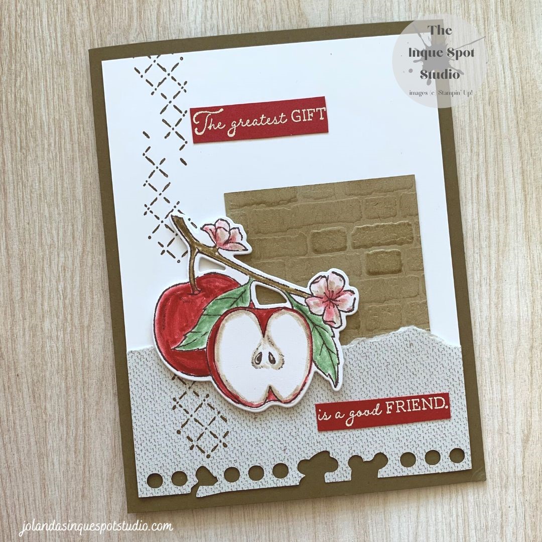 Welcome back! I got some of my chores finished. A trifecta for you. Tuesday’s featured stamp set on the Facebook Stampin’ Through the Catalog Challenge is Apple Harvest. I selected the sketch over at Just Add Ink (#626) and opted for the Color Dare (#519) challenge for the color choices. Here is the result: Steps:Continue reading “The Gift of a Good Friend – Apple Harvest”