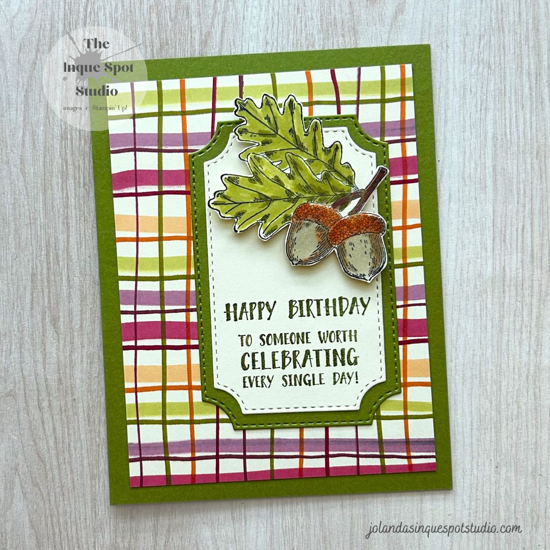 Welcome back! Happy Friday. Hoping you have great plans for the weekend. Playing with Claire’s current color suggestion from Paper Players (#750) and the Seize the Birthday (#297) No Flowers theme. Here is the result: Steps: All elements were adhered to the card base and the Acorn Branch was popped up with Dimensionals. A funContinue reading “Amber Autumn – Birthday Plaid”