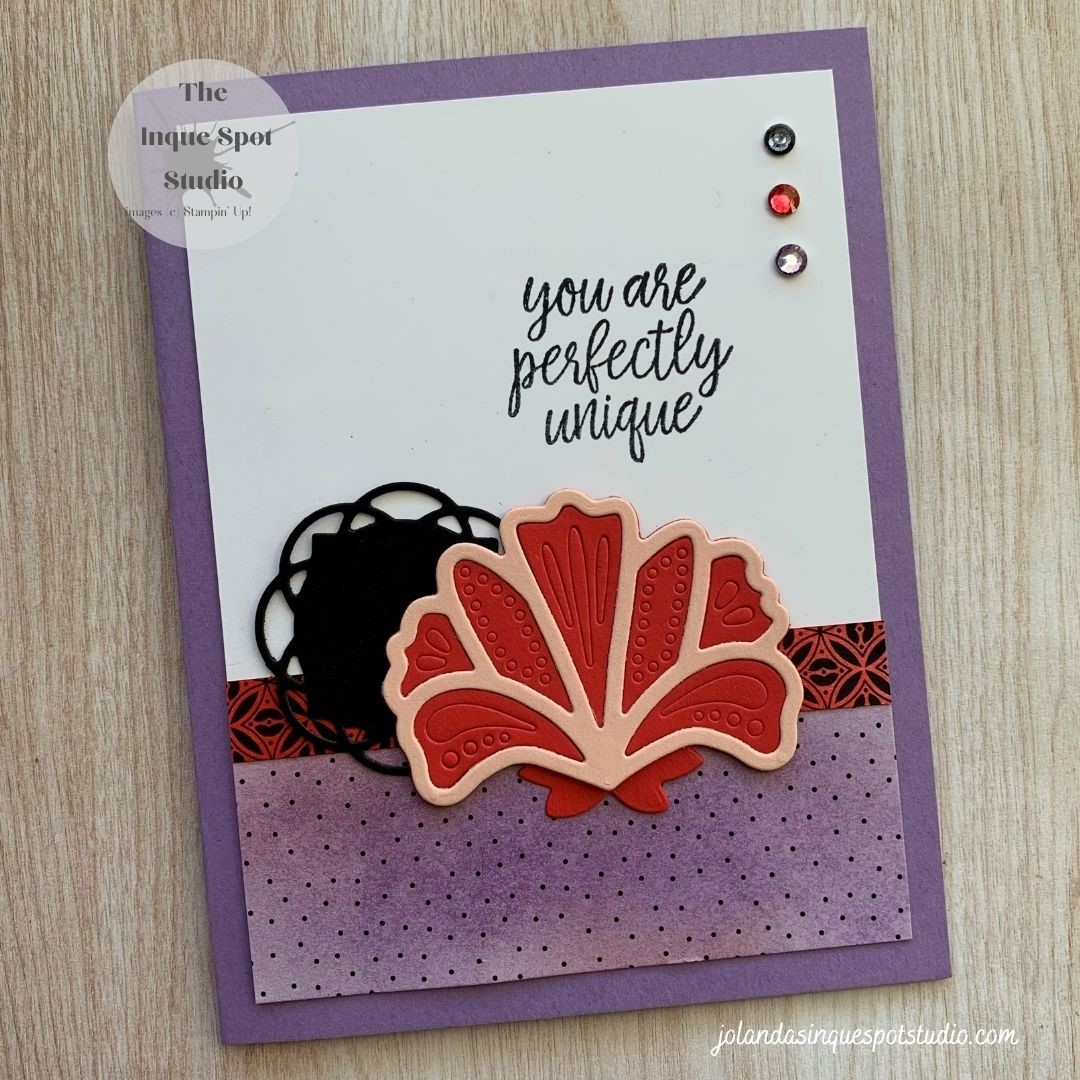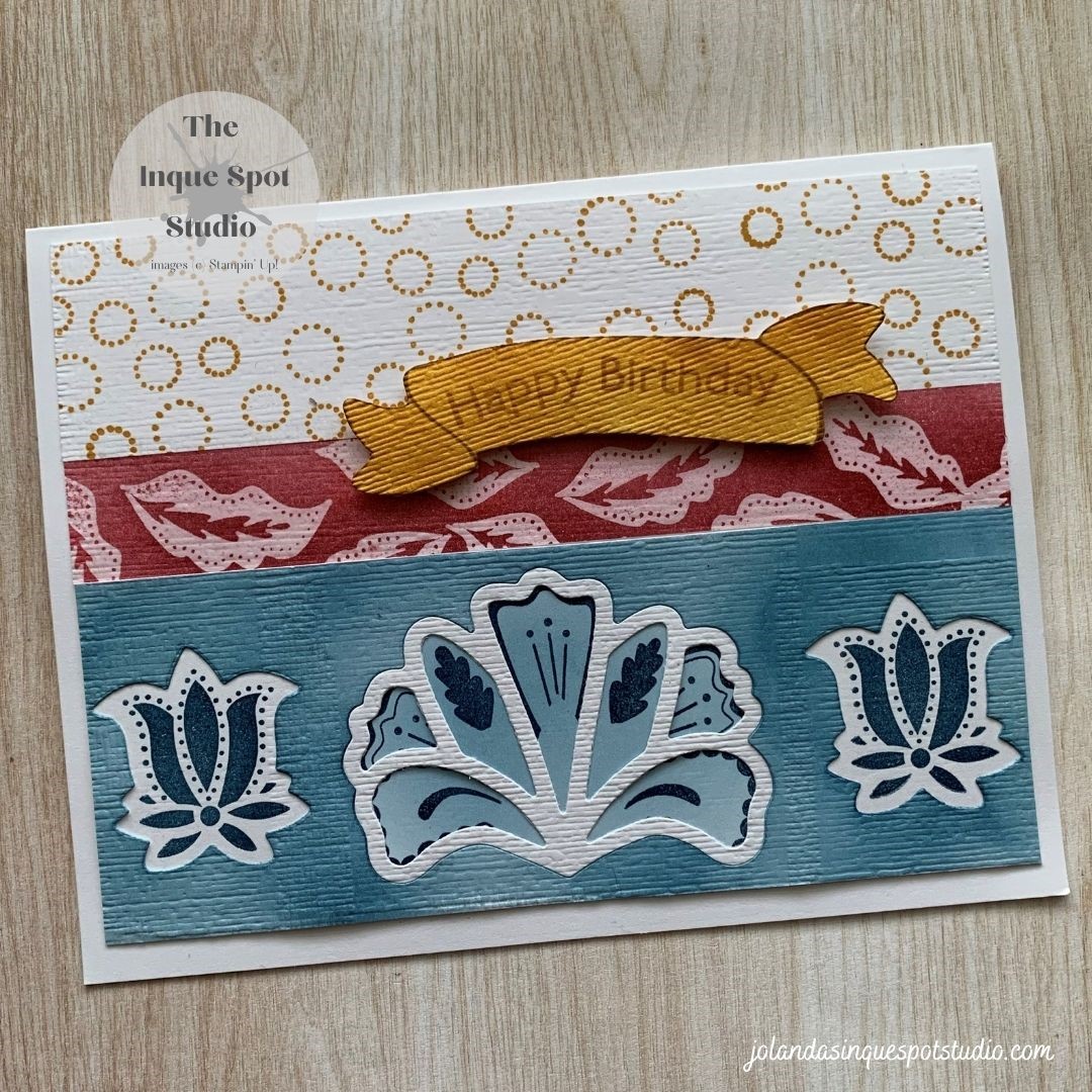 Hello and Happy Day! Quick card for you today featuring the Batik Boutique stamp set.… Over at CAS Colours & Sketches (#448), there is a double challenge. Some favorite retired colors, Delightful Dijon, Raspberry Ripple and Midnight Muse along with a sketch. Here is the result: Steps: Card Base: (8½” x 5½” scored at 4¼”)Continue reading “Batik Boutique – Happy Birthday”