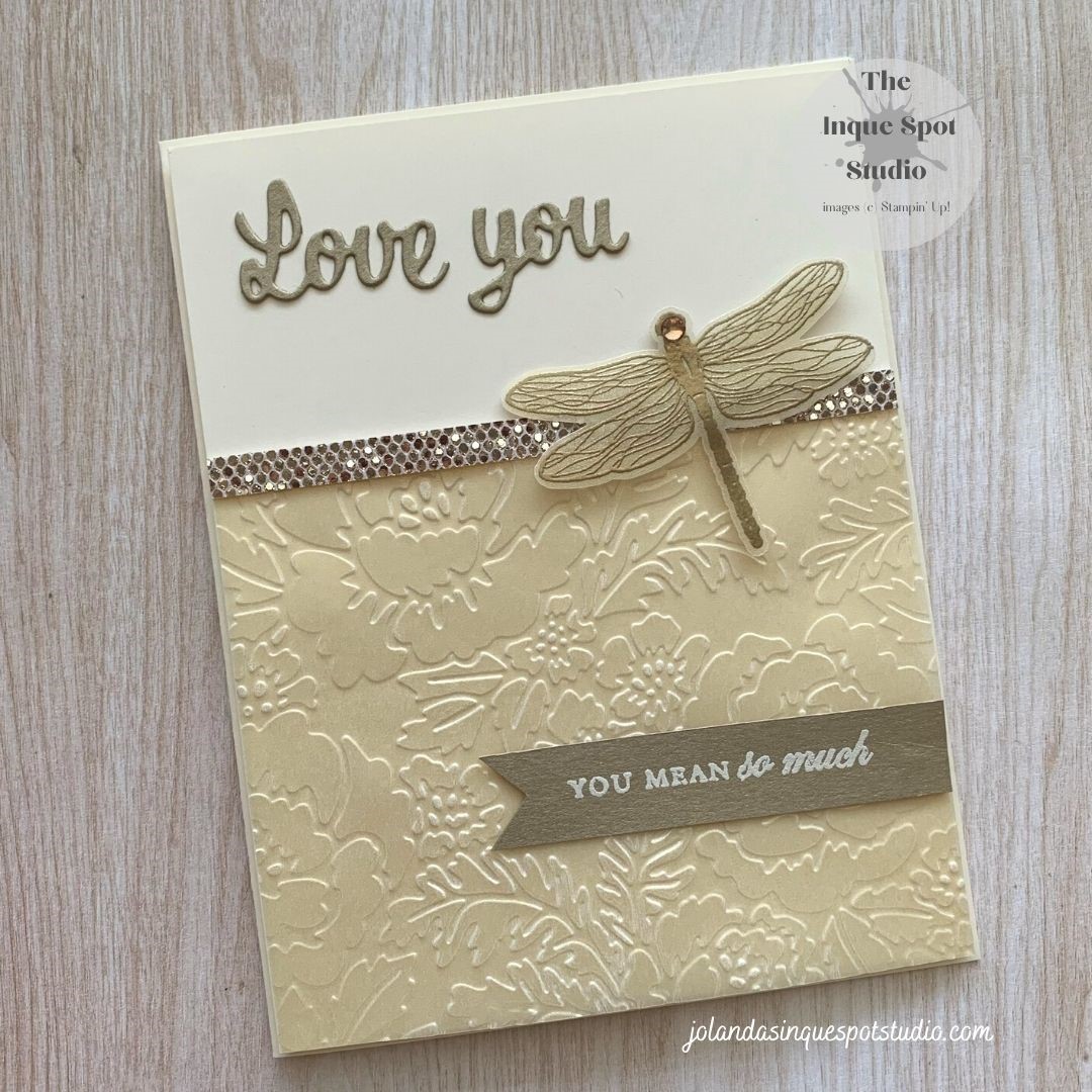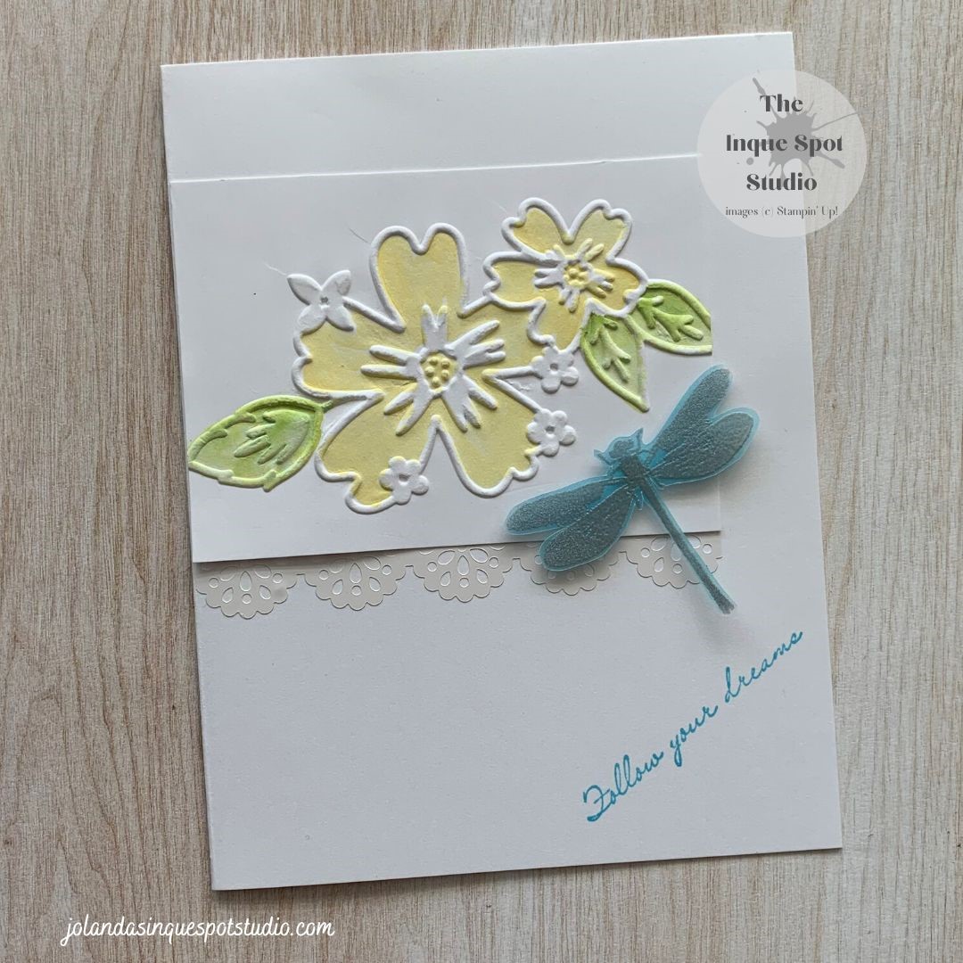 Color Challenge deadline…such pretty colors from the team at the Color Throwdown (#681). I just had to use them with my Inque Spot Studio Weekly Sketch Challenge. Here is the result: Steps: Card Base: (8½” x 5½” scored at 4¼”) Basic White cardstock. Background Panel: (4⅛” x 5⅜”) Basic White cardstock dry-embossed with the TimewornContinue reading “Dragonfly Garden Spring Floral Greeting Card”