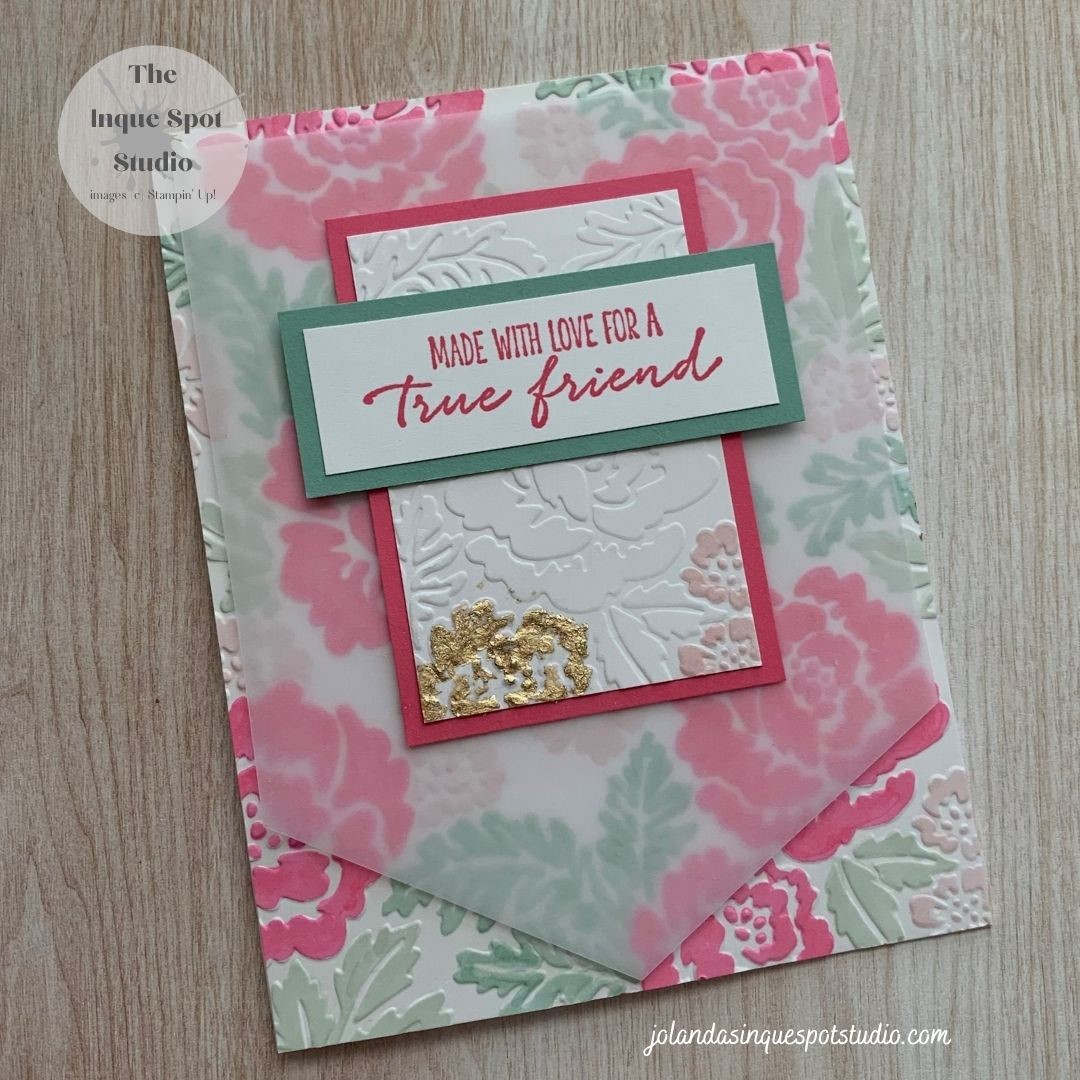 Having a play with the Sketch Saturday (#661) Challenge and combining it with the Hand Stamped Sentiments Inspiration Challenge (#364) along with the TGIF Material Challenge (#318). Flowers, Pinks, Greens, a touch of Gold…such pretty pictures. And this is the result: Steps: I dry-embossed a quarter sheet (4¼” x 5½”) of Basic White cardstock withContinue reading “Garden Wishes – True Friend”