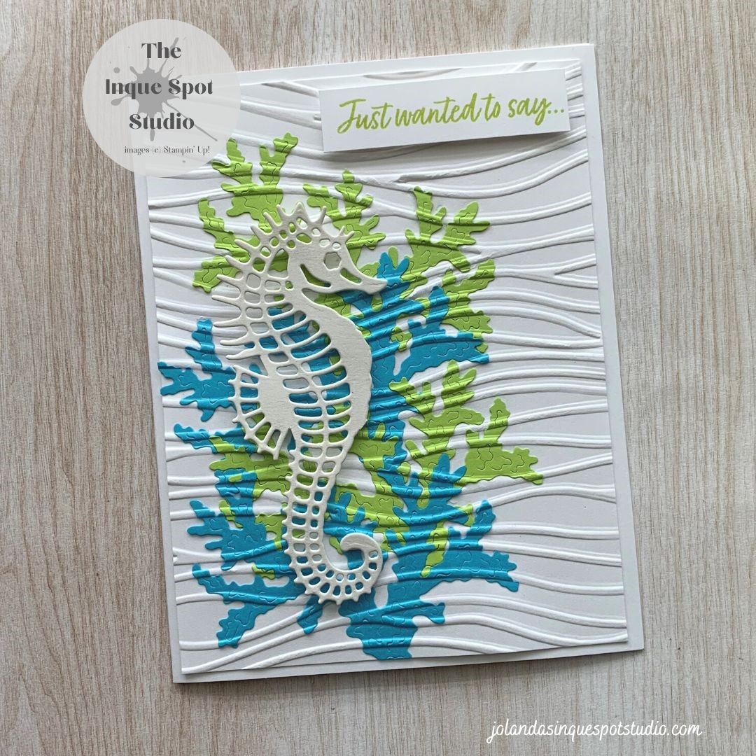 A little fun with some of my favorite colors… Playing with Less Is More (#488) for the theme and Cupcake Inspirations (#574) for the colors and sharing with Critter Crazy (#77). Here is the result: Steps: All elements were adhered to the card base. The Sea Horse and the Sentiment were popped up with Dimensionals.Continue reading “Under The Sea – Just Wanted To Say…”