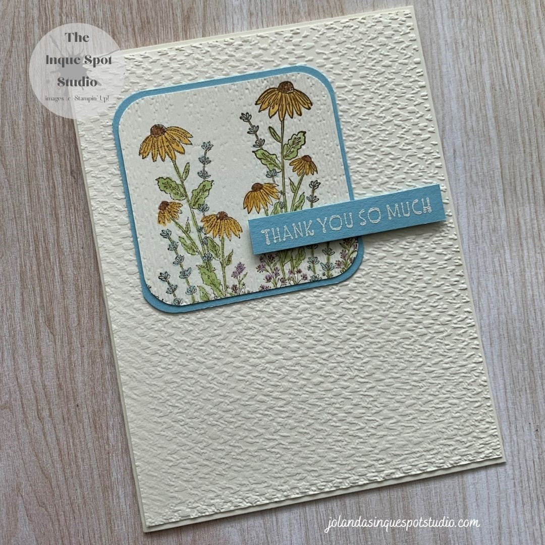 A quick little card to enter into the Freshly Made Sketch (#488) Challenge using the Reflection Technique. Here we go… Steps: Focal Image: The Black-Eyed Susan Floral image from the Dragonfly Garden stamp set was stamped in Soft Suede ink to the right and again on to a hard plastic sheet (much like that whichContinue reading “Dragonfly Garden – Thank You So Much”