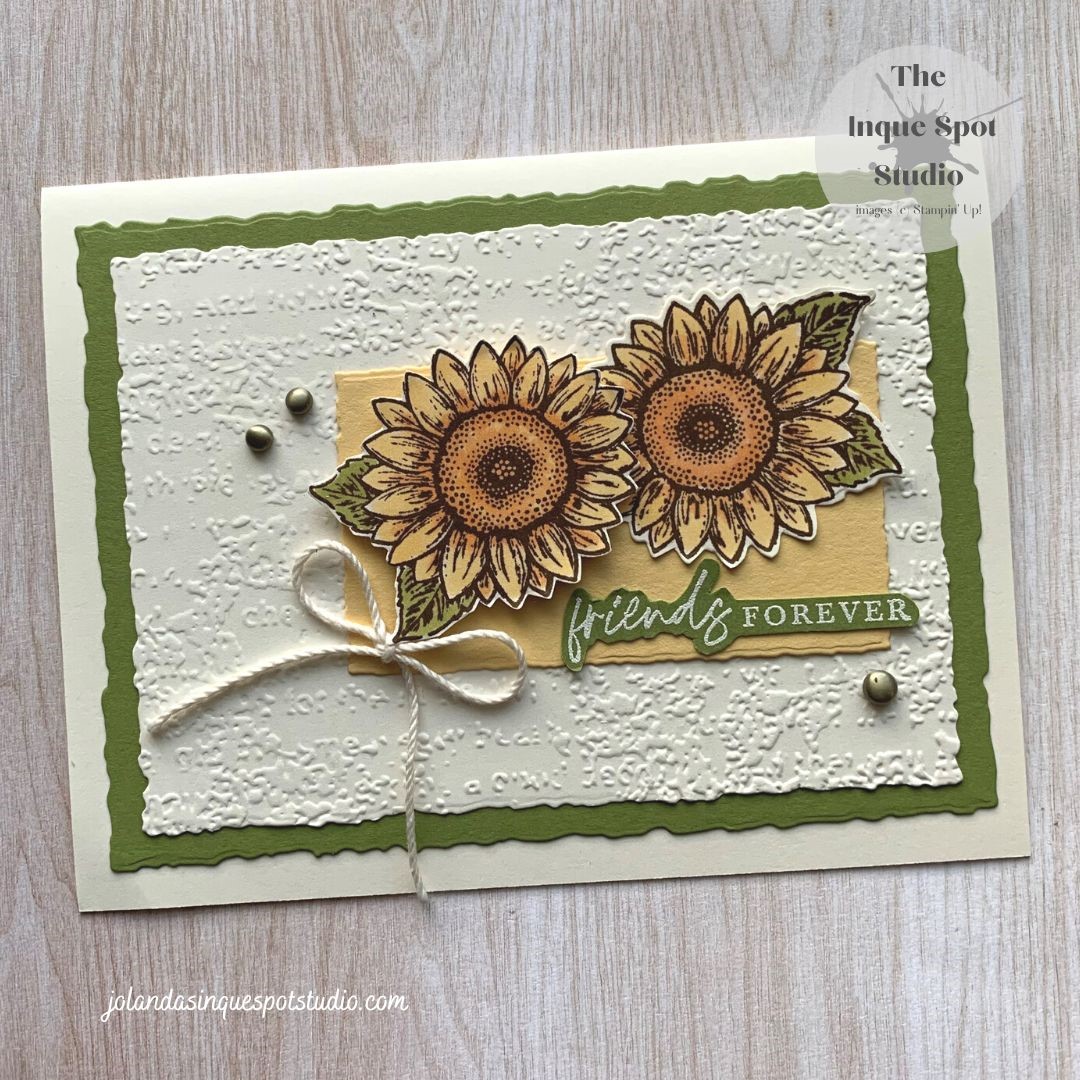 Welcome back to the Inque Spot Studio. Trying my hand at case-ing a card created by Stesha Bloodhart, this week’s Global Design Project (#368) challenge. I chose the layout, texture, edging, popped image, twine bow and dots. I opted for the colors and theme suggested by Double Trouble (#125) who is also partnering with InspirationContinue reading “Friends Forever – Celebrate Sunflowers”